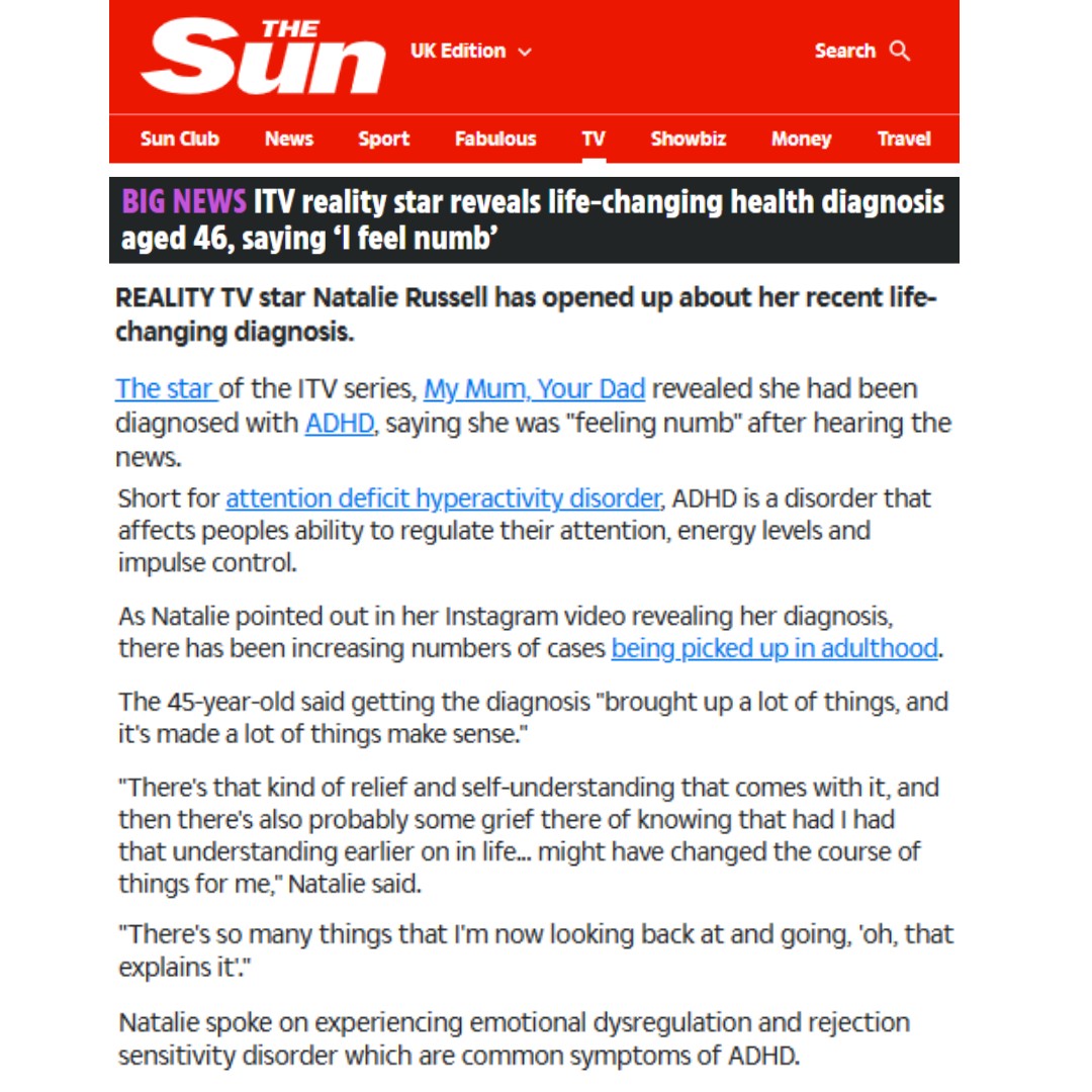 Natalie Russell, a reality TV star known for her appearance on ITV’s My Mum, Your Dad, has revealed that she was diagnosed with ADHD at the age of 45. In an emotional Instagram video, she described feeling “numb” upon receiving the diagnosis, which brought clarity to many of her past experiences. Russell shared that symptoms such as emotional dysregulation and rejection sensitivity had intensified during perimenopause, making her condition more apparent. She expressed both relief at understanding herself better and grief over not having been diagnosed earlier, noting that earlier awareness might have changed the course of her life. As a self-esteem and relationship recovery coach, Russell emphasised the importance of self-acceptance and compassion in managing ADHD. Her candid disclosure was met with strong support from her followers, who appreciated her openness and related to her experiences.